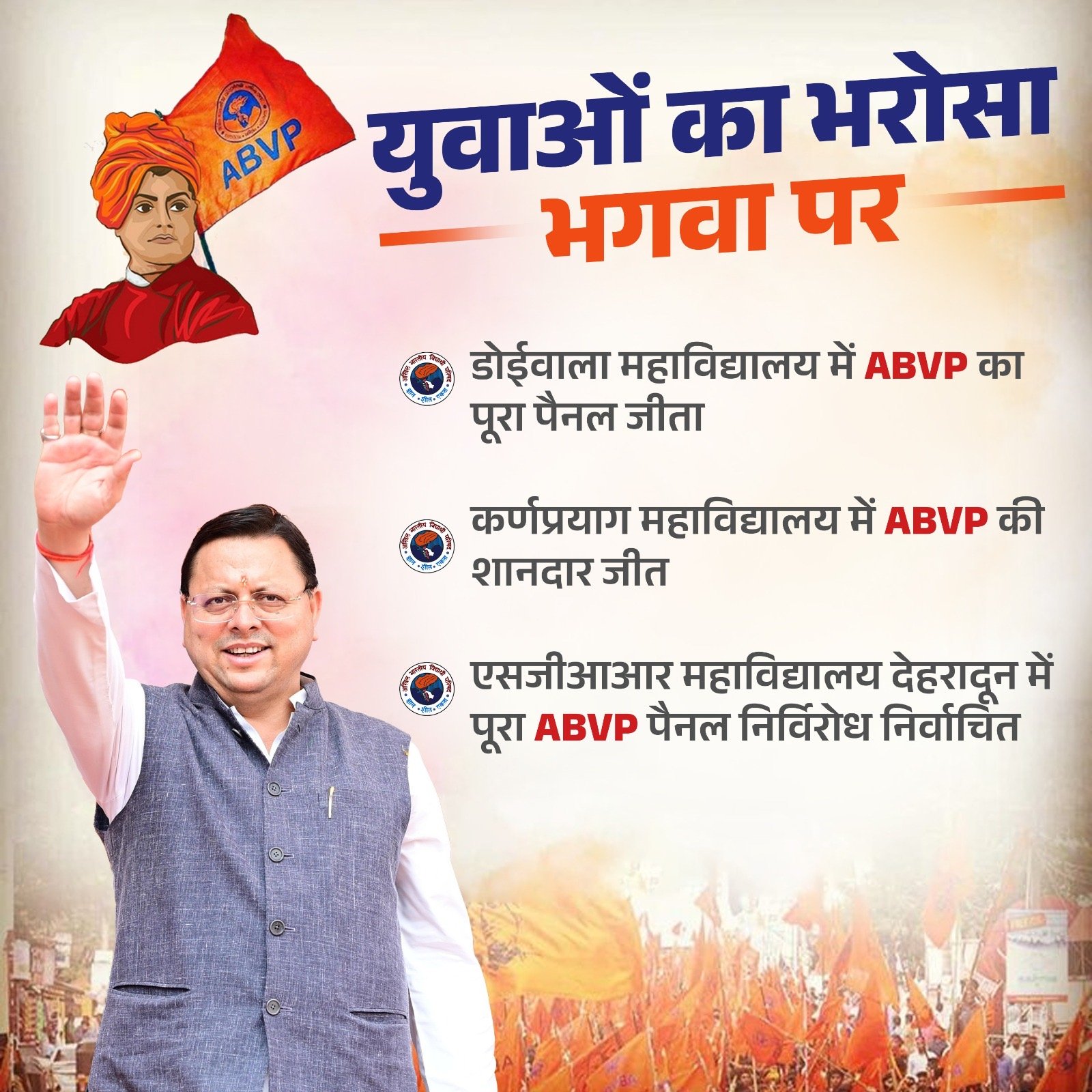 • उत्तराखंड छात्रसंघ चुनाव: ABVP की बड़ी जीत, युवाओं की पहली पसंद बने CM पुष्कर सिंह धामी