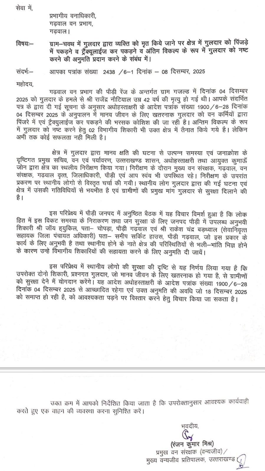 मानव जीवन के लिए खतरा बन चुके इस गुलदार को पकड़ने-मारने के लिए अब दो अनुभवी स्थानीय शिकारियों को औपचारिक अनुमति दे दी गई है।