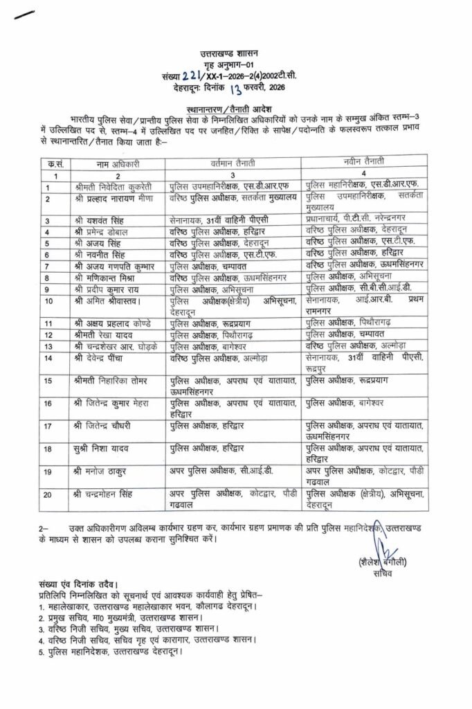 इसी क्रम में पुलिस विभाग में प्रशासनिक स्तर पर आवश्यक तबादले किए गए हैं। यह कदम पुलिस व्यवस्था को और अधिक सक्रिय, जवाबदेह और प्रभावी बनाने की दिशा में उठाया गया है।